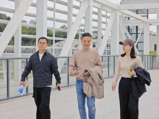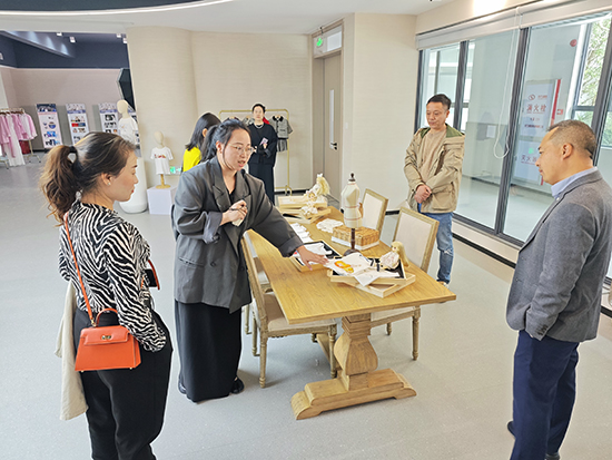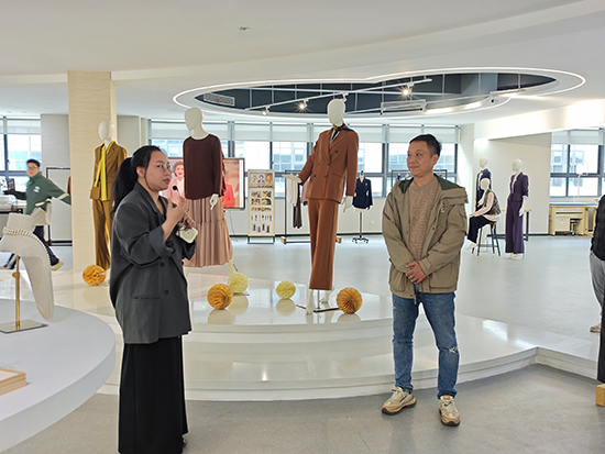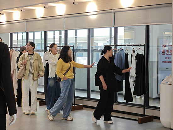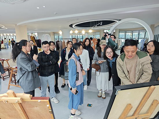 研修团队首站抵达温州市瓯海职业中专集团学校,在对方校领导陪同下,参观时尚设计学部服装实训室,实地了解产教融合模式。