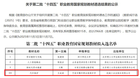 近日,教育部公示第二批“十四五”职业教育国家规划教材名单,宁波市鄞州职业高级中学王成波、王瑞君老师主编的《汽车维护》教材成功入选。此前,在首批“十四五”国规教材评选中,学校已有《二手车评估》(王成波、忻琴飞主编)与《汽车电器维修理实一体化教材(第2版)》(王成波、余斌立、忻状存主编)两本教材入选。此次再度入选,标志着学校汽修专业在国家级教材建设领域取得又一重大突破。