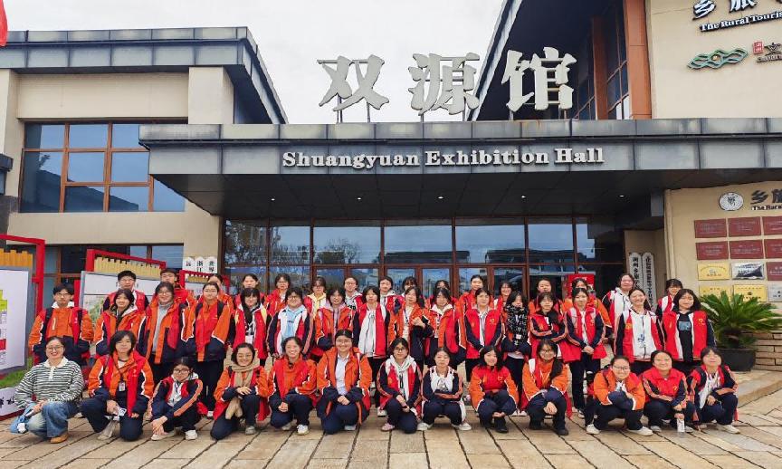 第一站,同学们首先来到了双源馆,动态流媒体技术将潞村千年变迁史娓娓道来。同学们沉浸在光影交织的时空长廊中,目睹着这片土地如何从古老的钱山漾文化走向现代文明。特别引人注目的是传统服饰在历史长河中的演变轨迹,为服装设计提供了丰富的灵感源泉。