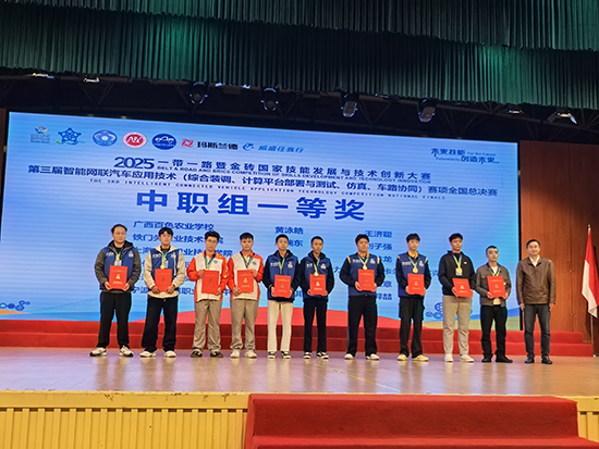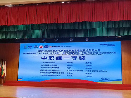 近日,2025一带一路暨金砖国家技能发展与技术创新大赛第三届智能网联汽车应用技术(综合装调、计算平台部署与测试、仿真、车路协同)赛项全国总决赛在安徽汽车职业技术学院圆满落幕。宁波市鄞州职业高级中学(以下简称“鄞州职高”)王成波、孙航雨老师辅导的黄子琪、孙羿喆学生团队从中职56队参赛选手中脱颖而出,荣膺一等奖,彰显了学校在智能交通技术领域的育人实力。