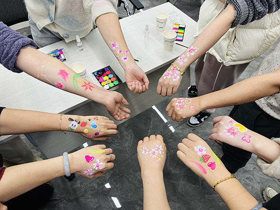 实操环节将课程推向高潮。学员们两人一组,手持专业彩绘笔和人体彩绘颜料,在手背上认真练习。韩佳音穿梭于课桌间,手把手指导笔触力度与配色技巧:“画花瓣要轻点提笔,画动物纹理要控制线条粗细。”一位学员在绘制蝴蝶图案时遇到困难,她在旁耐心示范,通过“先定轮廓后填色”的方法帮助学员快速掌握要领。教室里欢声笑语不断,有的学员专注地勾勒藤蔓枝叶,有的尝试将生肖元素融入设计,学习热情洋溢在每一个角落。