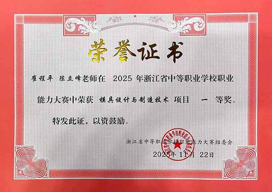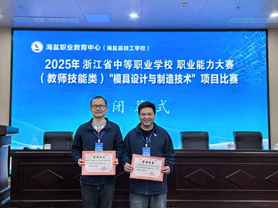 11月21日至23日,2025年浙江省中等职业学校职业能力大赛(教师技能类)“模具设计与制造技术”赛项圆满落幕。来自全省10个地市的优秀机械专业教师同台竞技,经过激烈角逐,海盐职业教育中心青年教师崔程平、陈立峰团队,凭借扎实的专业功底和精彩的表现,荣获团体一等奖(第1名)的好成绩。