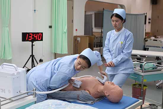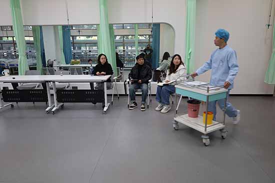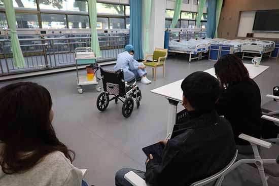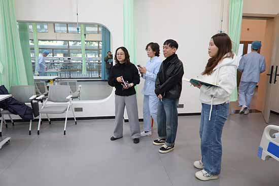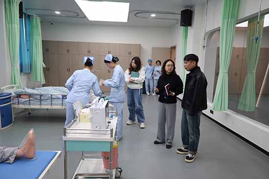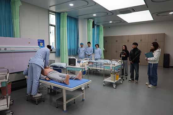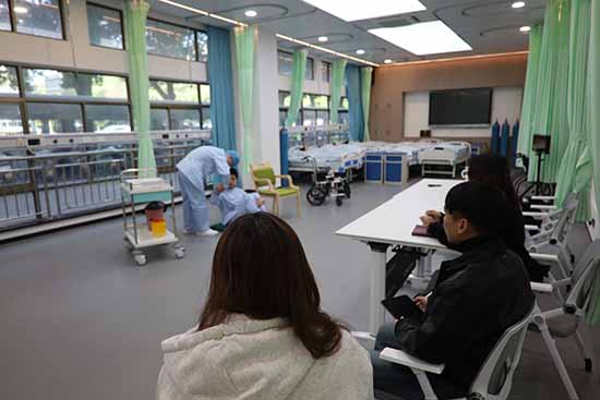 在陈杰校长的陪同下,徐飞波校长一行首先参观了护理实训基地。护理实训基地则以其高度仿真的临床环境、完善的实训设备和规范的教学流程,给来访嘉宾留下了深刻印象。宁波第三技工学校的护理教师还深入到海宁卫生学校(海宁市综合高级中学)护理备赛团队,观摩学生备赛演练。