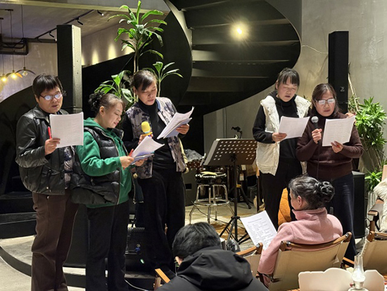 该培训首先由邀请到的专业人士黄斌给大家作了《Take me home,country road》英文歌曲内容介绍并就汉英对照进行了口语示范讲座,然后一句一句地教大家唱,再按照4人一组分组学唱,在学唱过程中,黄斌老师就英文发音,歌曲音调、音准等进行巡回指导。参训学员们根据教授的内容反复练习,根据老师讲解的要点,不停地在下发的曲谱上划圈句点,做着标记。整个培训过程伴随着静谧得的乡村之夜,氛围浓厚,气氛活泼,参与度高。培训结束后,参训学员们还以小组为单位进行学唱成果展示。