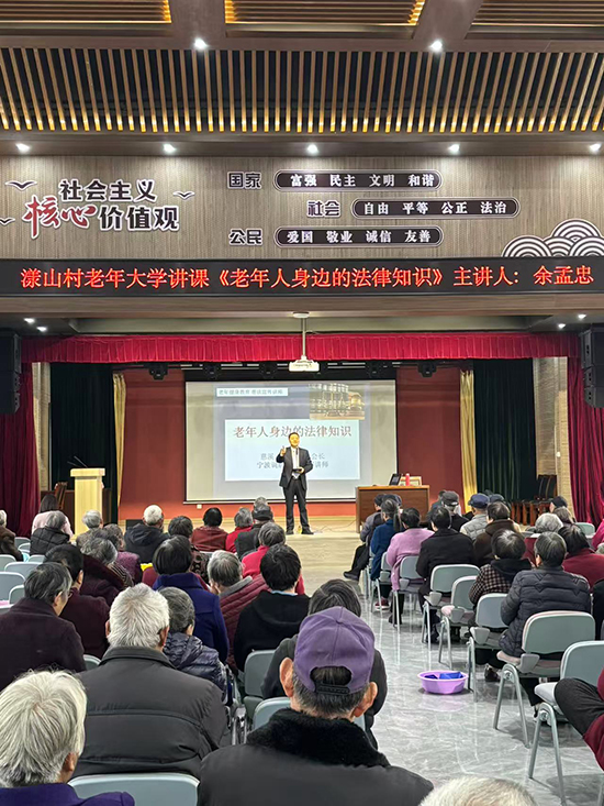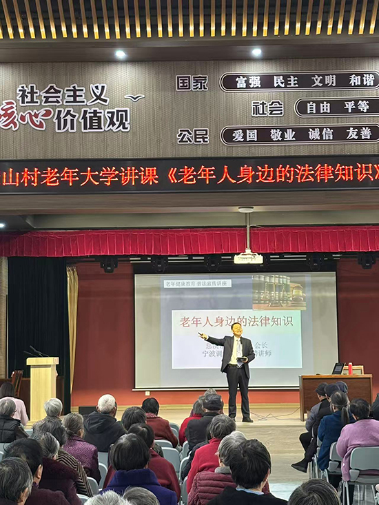为增强老年人法律维权意识,筑牢晚年生活法治屏障,11月27日上午,慈溪市宗汉社区教育中心特邀慈溪市调解协会会长、宁波调解学院特聘讲师余孟忠在漾山村老年大学,开展“老年人身边的法律知识”专题讲座。206名老年学员带着老花镜早早到场等候,不少人提前调试好手机相机,准备记录维权要点。