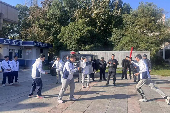 11月20日上午9时10分,德清职业中专校门口出现一名“暴徒”。该“暴徒”正持仿真砍刀冲击校门,四位安保手持护盾、3米长叉与抓捕器,组成“人墙”死死挡住了“暴徒”,他们大喊:“按警报!通知各楼层锁门!”于此同时,两名保安手持护盾左右站位,形成防御姿态,中间两位保安分别持长叉和抓捕器,瞬间将“暴徒”控制。