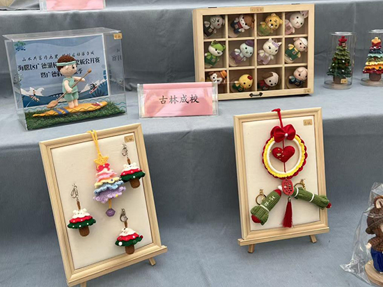在静态作品展区,古林成校的展示同样引人注目。手工钩织展区陈列着题材丰富、制作精美的作品,从传统的十二生肖、十二星座系列,到当下流行的拉布布玩偶、运动系列,再到各具特色的节日主题作品,琳琅满目,创意十足。