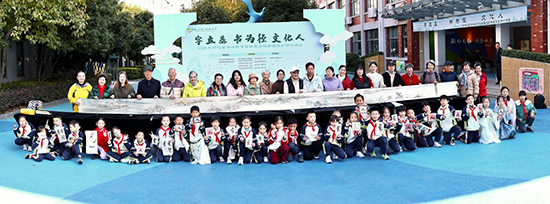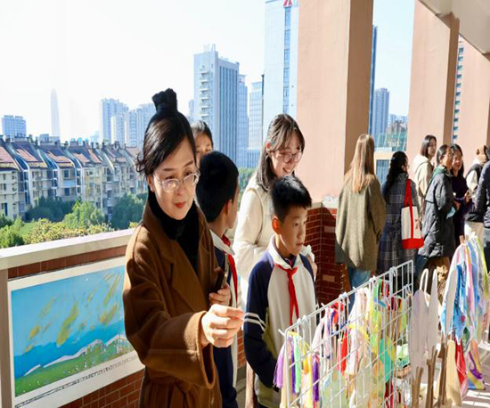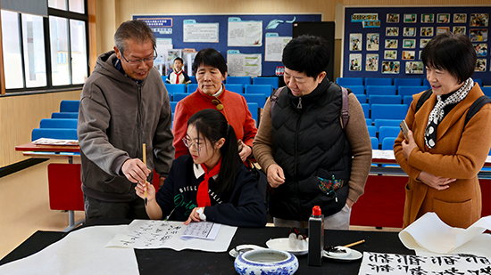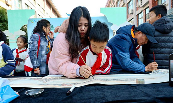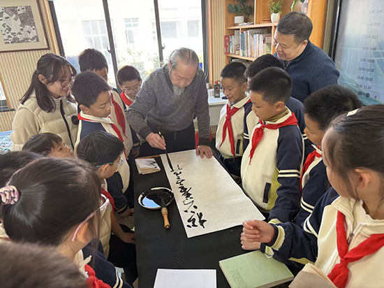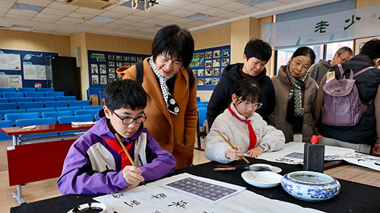 随后,老年学员化身“老教授”,走进书画教室,向孩子们传授书画技艺与人生心得。他们挥毫示范,从握笔姿势到笔墨章法,耐心讲解、细致指导。孩子们围聚观摩,眼中充满敬佩,不时提问求教。在墨香萦绕中,技艺与阅历实现“反向传承”,老少共同完成书法作品,并联手绘就“锦绣兰里”水墨长卷。这一刻,长幼携手、情感交融,温馨场面令人动容。一位老学员欣慰地说:“和孩子们在一起,自己也变年轻了。今天,我们成了‘同学’!”