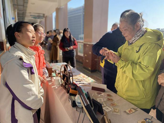 活动亮点集中在“双向导览 共学工坊”环节中“小先生”与“老教授”的角色互换。禹娃书画社的孩子们担任向导,热情地向老年学员介绍学校原创艺术作品展区。他们用稚嫩而清晰的语言,讲解每一件作品的创作思路与童趣想象,从水墨丹青到彩绘手工,尽显纯真与创意。老年学员们认真倾听、频频点头,不时与“小讲解员”交流互动。在岩彩画展区前,学员顾阿姨驻足良久,感慨道:“这些矿物颜料绘出的青绿山水永不褪色,孩子们的手艺真不简单!”