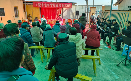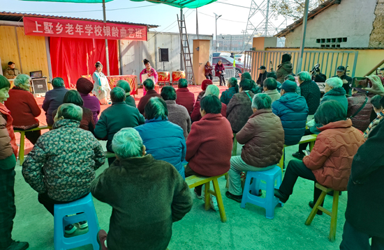 上墅学习中心的越剧老年长班经过多年积淀,每个学员从最初的不会如今都变成了能登台献艺的业余演员,为汇报成绩巩固学艺成果,我们想到了送戏进村一举双得的活动形式。首站刘家塘村越剧专场活动紧扣当地群众喜好,精选了《何文秀——心连心》《王老虎抢亲——寄闺》《碧玉簪——送凤冠》《孔雀东南飞——洞房》等多个经典越剧片段,让村民们耳目一新地感受越剧的独特魅力。简陋的舞台悠扬的弦乐响起,演员们身着精致戏服,扮相俊美,步态轻盈,灵动的身段、婉转的唱腔,不时赢得台下阵阵掌声。