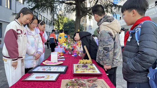11月25日下午,诸暨市枫桥镇洪绶小学广场热闹非凡、人头攒动。广场四周或摆放、或悬挂着一系列充满巧思的创意作品——落叶手工与环保手工作品琳琅满目,定格了秋日意趣。同学们驻足观赏,时而对着心仪作品轻声交流,时而在自己的作品前展露欣喜笑容,现场洋溢着浓厚的文化与实践氛围。