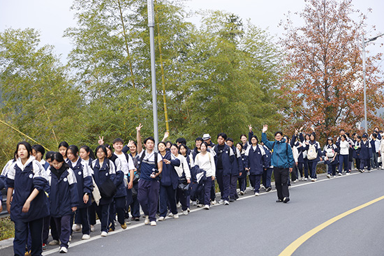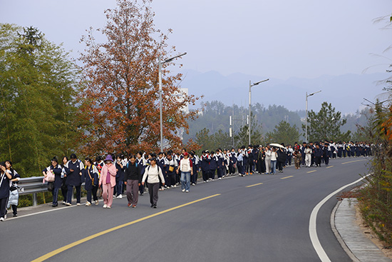 行进途中,秋景与队伍相映成趣。金黄的树叶随风飘落,铺就了一条天然的景观道。师生们一边徒步,一边感受大自然的馈赠。