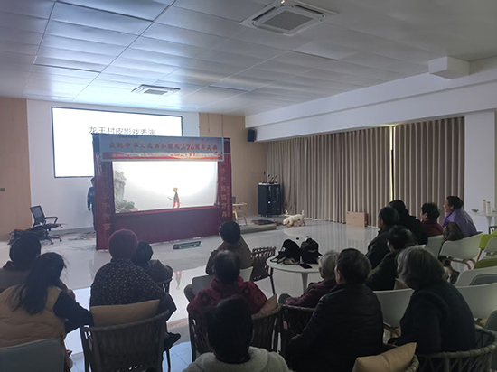 皮影戏,又称“影子戏”或“灯影戏”, 是一种以兽皮或纸板做成的人物剪影以表演故事的民间戏剧,有浓厚的乡土气息。本次活动邀请的是安吉县大河项家皮影艺术团,今天的表演选择了传统经典片段《杨家将》和新创剧《白茶王的故事》,在锣鼓弦乐声中,白色的幕布上光影跳动,栩栩如生的人物、跌宕起伏的剧情,引得台下老人们时而屏息凝神,时而开怀大笑,仿佛回到了童年看戏的美好时光。为了让体验更深入,大河项家皮影艺术团团长邀请了叔叔阿姨们走到幕后,亲手触摸皮影,并在工作人员的指导下尝试操作。王奶奶激动地说:“头一回自己耍皮影,真是太有意思了!”