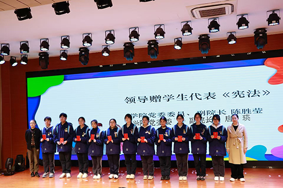 接过《宪法》,便是接过了公民的荣光与责任。陈胜莹副院长、唐瑛副院长为学生代表赠送《中华人民共和国宪法》,这本红色典籍,将成为学子们未来人生路上的航标,指引他们坚守法治信仰,践行公民责任。