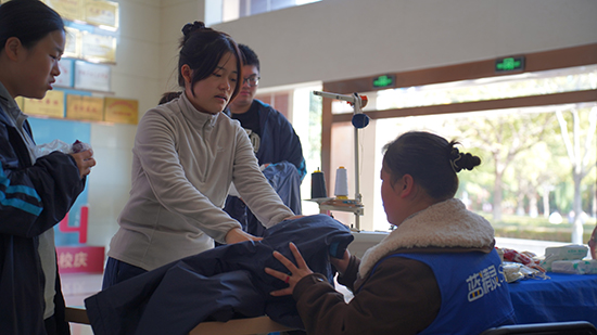 活动当日,服务站前师生络绎不绝。服装设计与工艺专业的学生在校企双师的共同指导下飞针走线,让一道道裂口悄然“愈合”,尽显扎实的技能功底;艺术设计与制作专业的学生全程跟进现场视觉维护,运用色彩与构图,传递冬日里的小温暖;还有贴心准备的小礼品,承载着心意与温度,被送到师生手中。