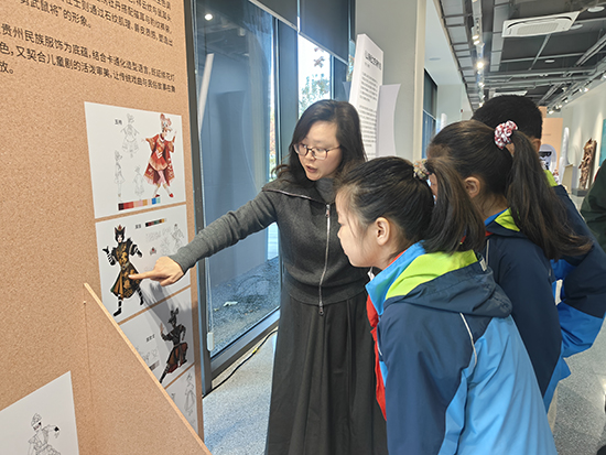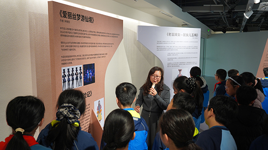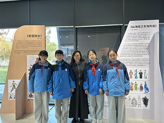 在上城区文化特派员张西琴的介绍下,孩子们的好奇心被彻底点燃。在《老鼠嫁女》展区,大家围着手稿追问苗族刺绣的寓意;看到《琵琶行》的服饰配色变化,有同学主动分享自己对诗句的理解。张西琴为孩子们搭建起通往专业艺术领域的桥梁,她结合展品细致拆解设计背后的文化内涵与创作逻辑,让孩子们读懂蒙古族图腾、唐代服饰形制如何与剧情深度融合,明白AI技术如何为传统纹样数字再生赋能。