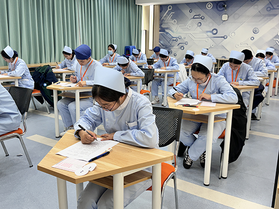 理论考场上,选手们沉着执笔,凭借扎实基础流畅作答,尽显对护理知识的熟练掌握。