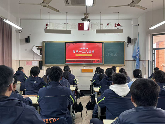 在各团支部的主题团课上,班主任和团干部们化身“红色讲解员”,通过老照片、历史纪录片、情景讲述等多种形式,生动再现了一二·九运动的壮阔历程。为扩大活动覆盖面,营造全员参与的浓厚氛围,校团委联合德育处开展“匠心筑梦 技能报国”主题宣讲。校团委书记倪梦霞、校德育主任徐先锋将一二·九运动的历史意义与当代职校生的成长成才紧密结合,带来了两场有温度、有深度的宣讲。宣讲结束后,全体师生庄严列队,在领誓人学生会主席的带领下,大家高举右拳,字字铿锵:“铭记一二•九历史,传承爱国精神;锤炼专业技能,勇担时代使命;勤学善思笃行,不负青春韶华;匠心筑梦强国,书写复兴华章!”激昂的誓言回荡在校园上空,既是对革命先辈的致敬,更是职教青年矢志报国的坚定承诺。“一二·九运动的硝烟早已散尽,但‘爱国、进步、民主、科学’的精神永远不会过时。”副校长刘著程在活动总结时强调:“作为职教青年,大家既要铭记历史,更要立足当下——在实训室里精益求精,在课堂上勤学善思,在志愿服务中传递温暖,这就是对一二·九精神最好的传承。”