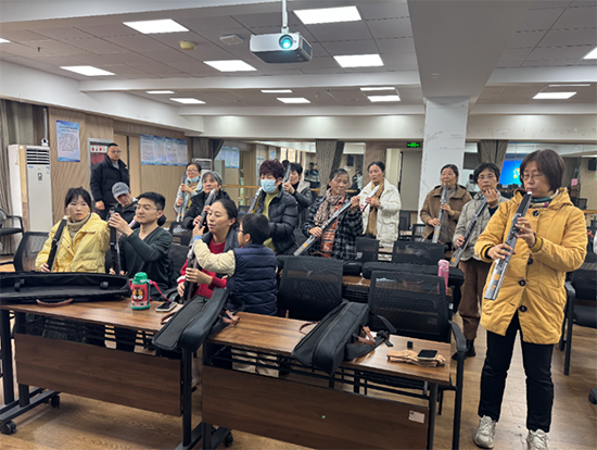 考虑到学员们多是零基础入门,讲解格外耐心细致。学员们则全神贯注,跟随指导进行初步尝试。老人戴起老花镜,认真辨识指法图示;旁边的年轻人则专注于气息控制,反复练习长音。