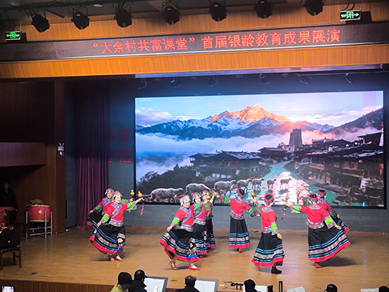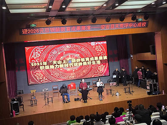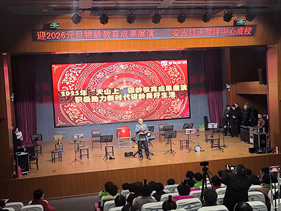 12月24日下午,安吉县天荒坪镇山河村文化礼堂内欢歌笑语、暖意融融,天荒坪中心成校“迎2026元旦银龄教育成果展演”在此精彩上演。天荒坪中心成校及下属上墅成校、山川成校的老年长班学员联袂献艺,近300名村民欢聚一堂,共赏这场充满银发活力的文化盛宴。