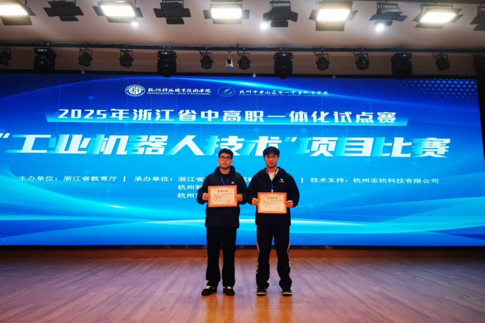 12月12日至14日,2025年浙江省中高职一体化试点赛“工业机器人技术”项目在杭州市萧山区第一中等职业学校举行,德清职业中专与湖州职业技术学院组成的学生团队荣获一等奖。团队由23机器人3+2班郭想和湖州职业技术学院虞添两位学生组成,学校黄宇老师和湖职院张芹老师担任指导教师。