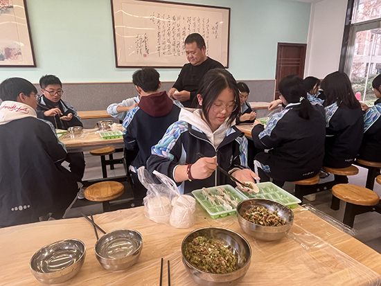 活动当天,食堂一改往日“单向供餐”的模样,摇身变成温馨的“家庭厨房”。有的家长手法娴熟,擀出的饺子皮薄如纸、圆如月。有的学生第一次包饺子,虽然包得歪歪扭扭,却满脸自豪。老师们也不甘示弱,一边包一边打趣:“这褶子捏得,比我写教案还认真!”