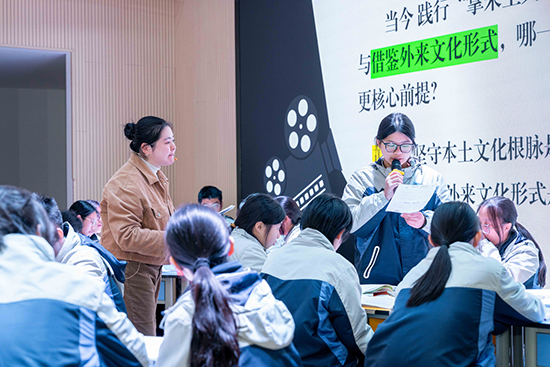 第二组《拿来主义》同课异构别出心裁,衢州市工程技术学校雷欢老师以“文化诊疗”为线索,拆解鲁迅的论证逻辑与语言智慧。宁波外事学校高涛老师则以《哪吒2》《花木兰》为案例,将经典与当代文化融合结合,从“拿来”进阶到“共生”,让经典文本在时代语境中焕发新活力,实现思维与价值的双重引领。