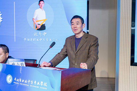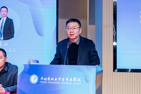 王献讲话。他代表平湖市教育局向莅临活动的领导、专家和老师们致以热烈欢迎,向主办单位省教育厅职成教教研室、嘉兴市教育学院表示衷心感谢。王献以“地域优越、经济富饶、人文平和”三个关键词介绍了平湖的地理位置、产业经济和人文底蕴。他表示,职业中专是平湖职教的金字招牌与城市名片。他期待本次年会能够汇聚全省智慧,破解中职语文教学服务学生发展、支撑产业升级的时代课题,助力职教高质量发展。