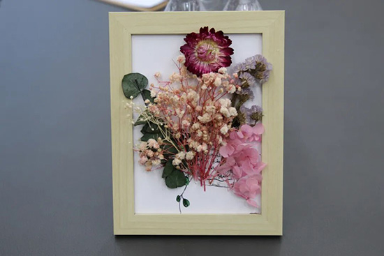 活动伊始,工作人员首先向大家介绍了本次活动的主题、流程以及干花的养护知识、相框制作的技巧要点。工作人员结合提前制作好的成品,详细演示了干花的挑选、搭配、固定等步骤,并耐心讲解了不同花材搭配所呈现的风格效果,帮助大家打开创作思路。