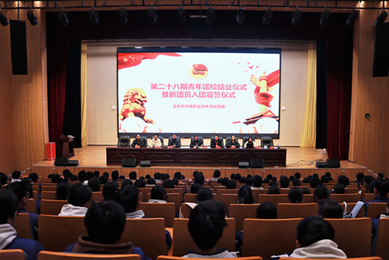 12月25日中午,玉环市中等职业技术学校在学校大报告厅隆重举行第二十八期青年团校结业典礼暨新团员入团宣誓仪式。学校副校长金松,政治辅导员蔡其标、汪光岳、王金伟,团委书记袁安及506名结业学员参加。仪式由团委副书记林旭环主持。