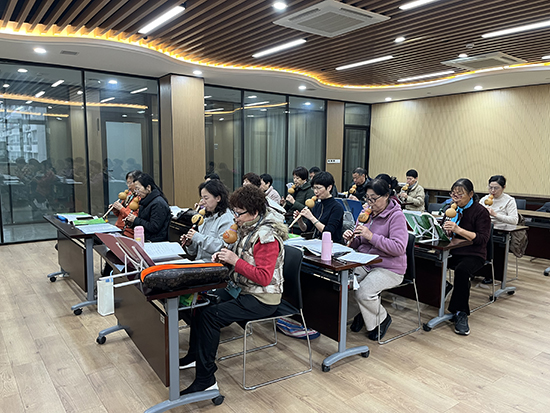 葫芦丝班的课堂上,曾是零基础的学员们手持乐器,指尖翻飞间,《月光下的凤尾竹》《映山红》等经典曲目缓缓流淌。从气息控制到指法练习,从单音吹奏到乐曲合奏,在老师耐心细致地指导下,老人们攻克了一个又一个难关,将悠扬婉转的旋律化作对生活的热爱。结业展示时,学员们默契配合,合奏曲目赢得满堂喝彩。
