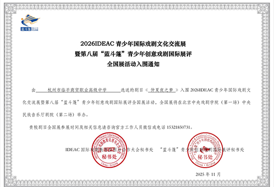 2025年12月25日至28日,浙江开放大学临平学院EchoStage英语戏剧社的十位学生演员在指导教师姜琢瑕、童小琴老师的带领下远赴北京,参加IDEAC青少年国际戏剧文化交流展暨第八届“蓝斗篷”青少年创意戏剧国际展评,在中央戏剧学院主剧场演绎了由团队改编的莎士比亚经典作品《仲夏夜之梦》。