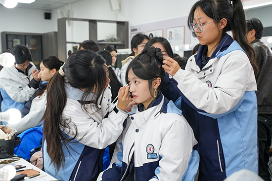 美发与形象设计专业师生联合企业妆造导师,提前打磨定制妆造造型,打造出干练职场风、雅致新中式、复古摩登风、圣洁婚纱风等多款特色造型。拍摄过程中,化妆师们第一时间观察镜头中妆面的呈现效果,及时上前为模特补妆、修整发丝,让妆造与光影、场景达到最佳契合。