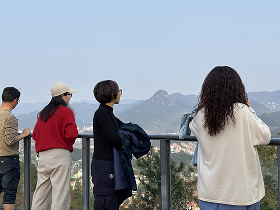 到达山顶观景平台后,老师们极目远眺,安吉县城的现代城市风貌与周边的绿水青山交相辉映,大家纷纷拿出手机合影留念,记录下这美好的瞬间。短暂的休憩交流后,大家带着满满的活力与愉悦的心情,安全下山返回。