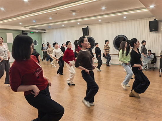 时尚排舞课程则创新采用“线上+线下”同步授课模式,因场地空间有限,线下仅开放30个名额,学员们早早到场,在教师的带领下跟着节奏舒展肢体、活力起舞,现场氛围热烈欢快;线上则通过钉钉直播的方式,同步向广大市民开放,几十名无法到场的学员在线上同步观看、跟练学习,打破空间限制,让更多人能够参与到课程中来,实现“足不出户也能学技能”。