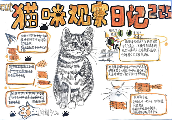 回到课堂,孩子们将户外观察的点滴收获,化作笔下鲜活生动的自然笔记。一幅幅作品充满童趣与巧思:有细致刻画猫咪五官与习性的创意笔记,有完整呈现蝴蝶生命周期的科普笔记,有记录桃花生长全过程的精美手绘,还有细节满满的动物观察、梅花生长功用解读、银杏叶果全方位解析等作品,一张张手抄报定格了本次实践活动的丰硕成果。
