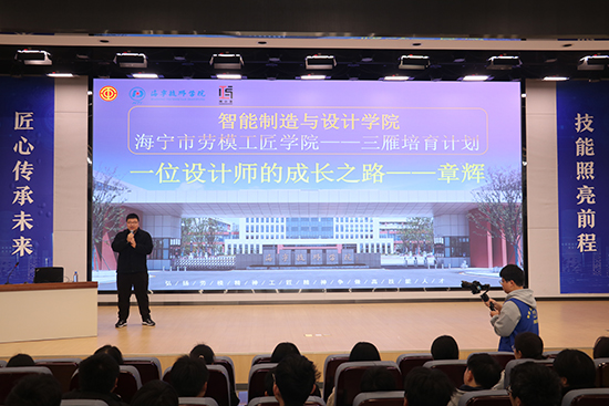 为深入弘扬劳模精神、劳动精神与工匠精神,加强学生思想政治教育和职业素养培育,引导青年学子树立正确的劳动观与成才观,2026年3月23日,海宁技师学院(智能制造与设计学院)联合海宁市劳模工匠学院,在尖山校区持续推进“三雁培育计划”,邀请行业先锋、新时代工匠章辉走进校园,搭建成长交流平台,助力“鸿小匠”成长为担当“中国精造”使命的“未来工匠”。