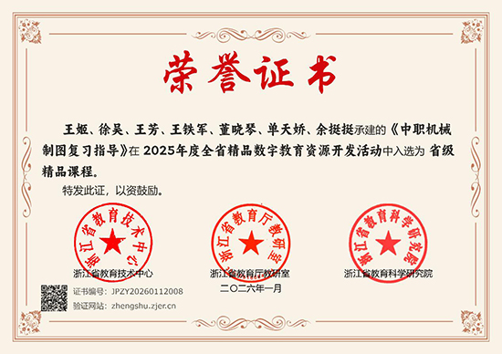 近日,由浙江省教育技术中心、浙江省教育厅教研室、浙江省教育科学研究院联合组织的2025年度全省精品数字教育资源开发活动评选结果正式揭晓,由省特级教师王姬领衔,王姬名师工作室学科带头人徐吴、王芳、王铁军、董晓琴、单天娇、余挺挺老师组建的教学团队申报的名师金课《中职机械制图复习指导》,凭借优质的内容设计、创新的教学模式及鲜明的职教特色,成功获评省级精品课程,再添一项省级殊荣。