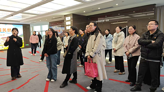 在港区讲解员的引导下,党员们依次参观了综合楼大厅、十二楼观景平台、展厅及电子沙盘,深入了解穿山港区的发展历程。穿山港区是全球第二大单体集装箱码头,2024年完成吞吐量1151万标准箱,是我国前沿水深最深、泊位等级最大的集装箱码头之一。
