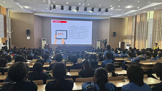 2026年4月2日下午,诸暨市职业教育中心在学校报告厅为高一年级全体学生举办了一场主题为 《法治护航青春》 的普法教育专题讲座,旨在增强青少年法治意识,筑牢校园安全防线。时值刚刚过去的第31个全国中小学生安全教育日(3月31日),本场讲座作为学校安全教育日系列活动的重要一环,特邀诸暨市人民检察院检察官黄利爽主讲。黄检察官用通俗易懂的语言和真实鲜活的案例,为同学们带来了一场别开生面的法治课。