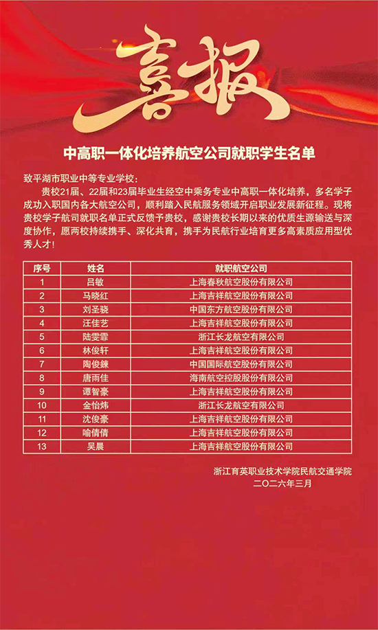 近日,浙江育英职业技术学院向平湖市职业中等专业学校发来《中高职一体化培养航空公司就职学生名单》喜报:13名21届、22届、23届毕业生成功入职国内各大航空公司。这份喜报满载荣光,既是对学校学子拼搏奋进的最高褒奖,更是对两校合作办学成果的权威认可。自2015年携手开办航空服务中高职一体化五年制教育以来,十年耕耘,匠心育人。一批批心怀蓝天梦的学子从这里启航,在万米高空书写青春华章。
